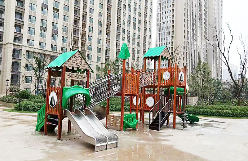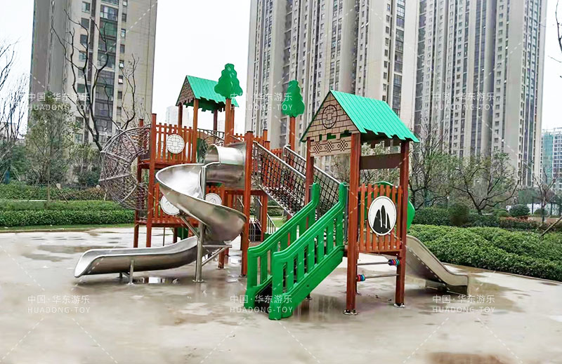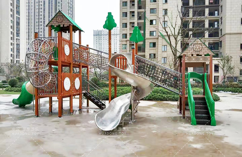 荣盛华府选用的是ky开元游乐自主设计的具有攀爬网、U型爬网、不锈钢滑梯、网桥、滑桶为一体的综合性游乐设备。