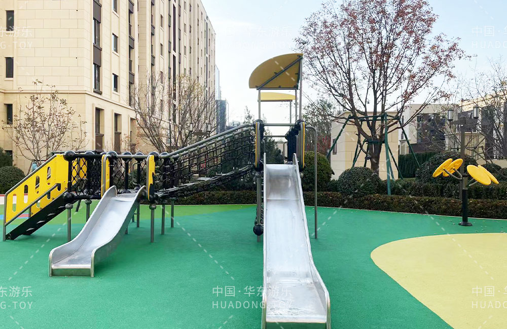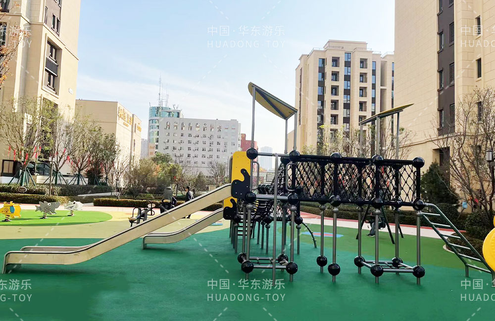 太原华润昆仑域地产项目选用的是ky开元游乐自主研发的游乐设备,娱乐场里选用了健身器材、具备攀爬网、不锈钢滑梯为一体的综合性游乐设备,为生活在该小区的人们提供了一个生活、休闲、娱乐的场所。