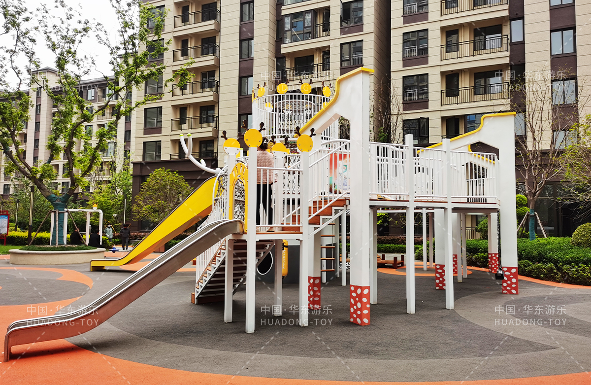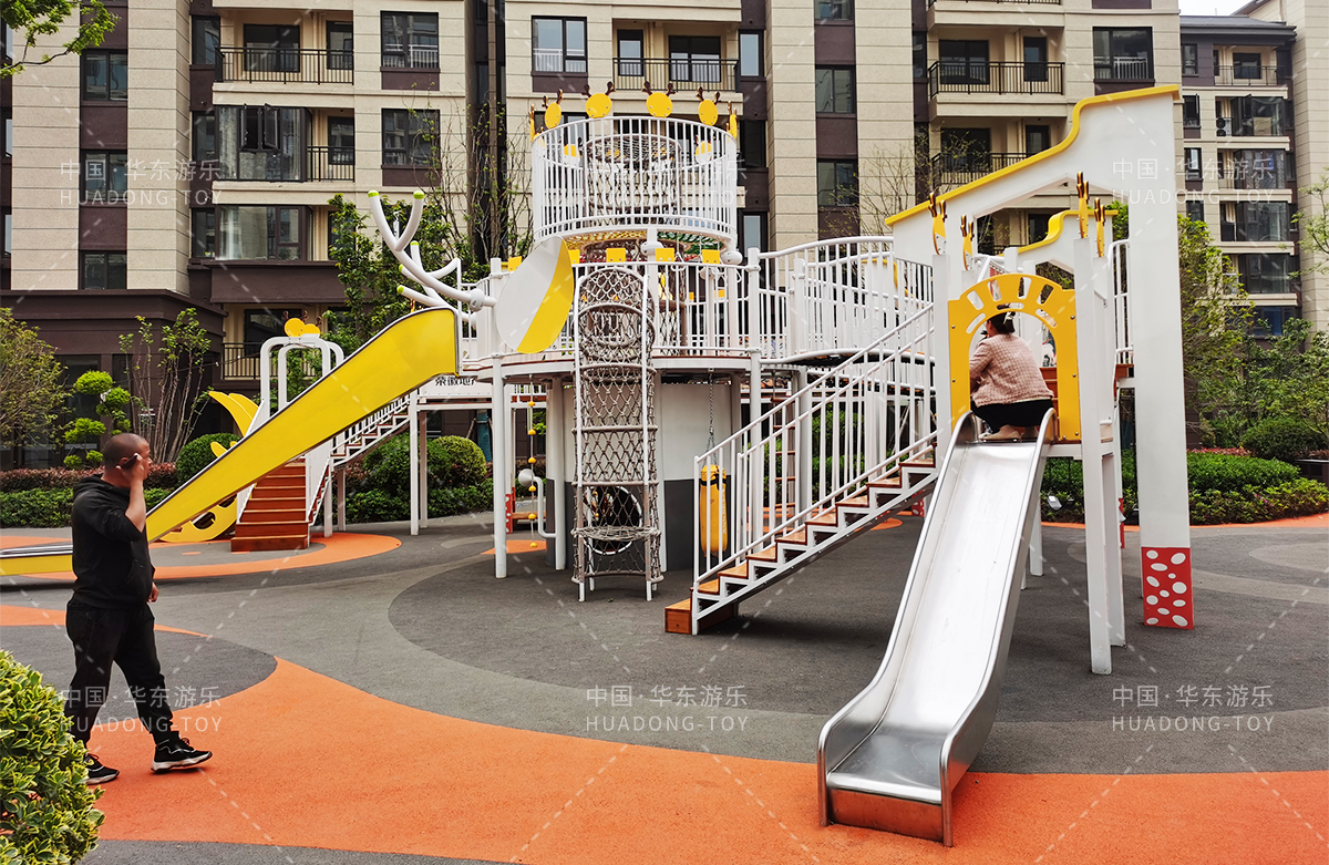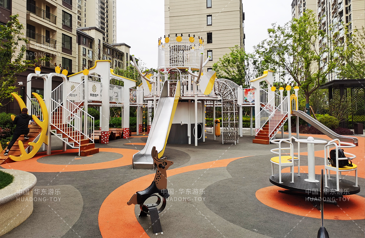 东方名府云著此次选用的是ky开元游乐自主研发和生产的无动力游乐设备,采用的是以麋鹿为主题的综合性游乐园,整个游乐园分别设计了小朋友喜欢的儿童跷跷板、打击乐器、儿童摇摇乐,以及和具备不锈钢滑梯、攀爬网、攀爬绳、攀爬梯等功能的麋鹿组合滑梯等游乐设备。