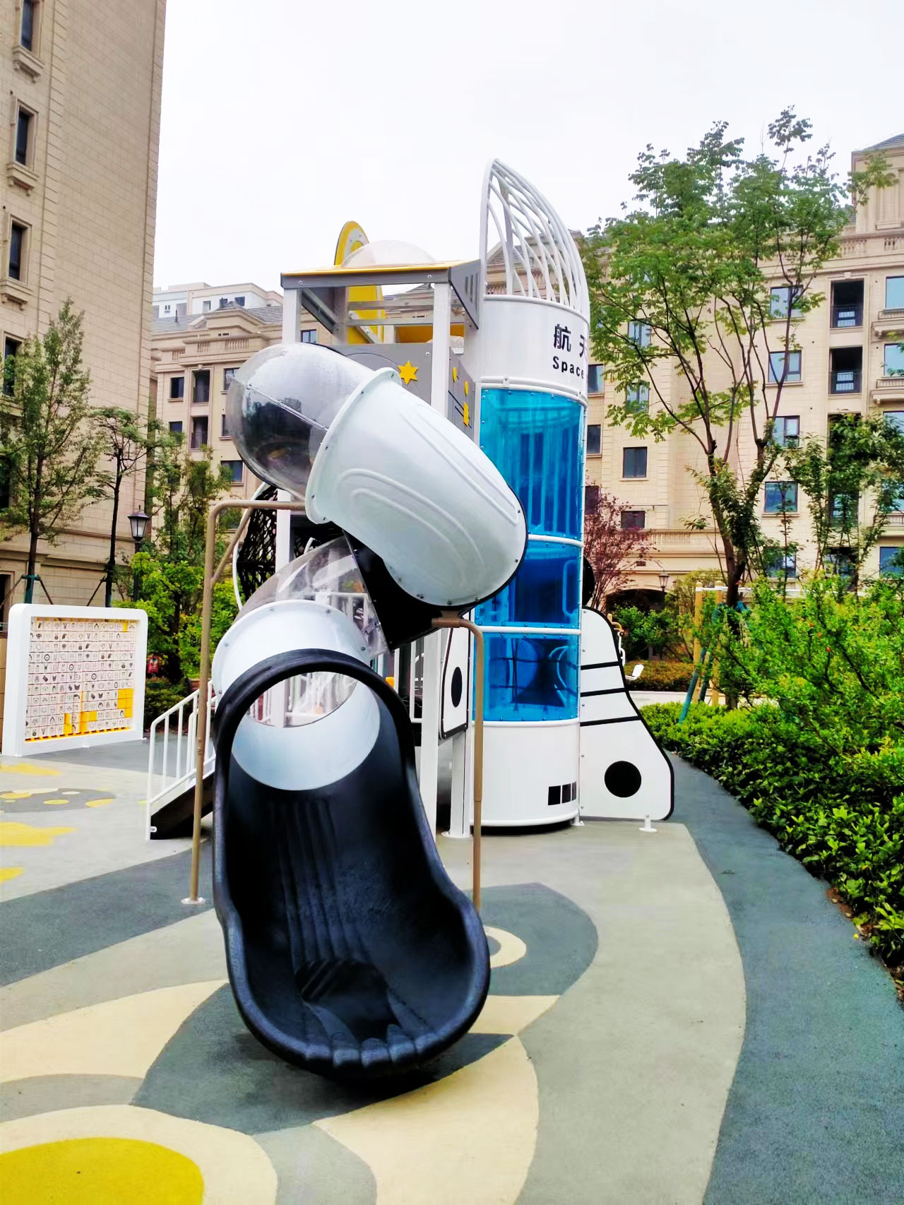该项目是一个以航天飞机为主题的综合性游乐场,设计了小朋友喜欢的儿童摇摇乐、组合秋千、儿童跷跷板、旋转椅、大型航天飞机等游乐设备,充分的挖掘了小朋友对于未知世界的探索欲望。