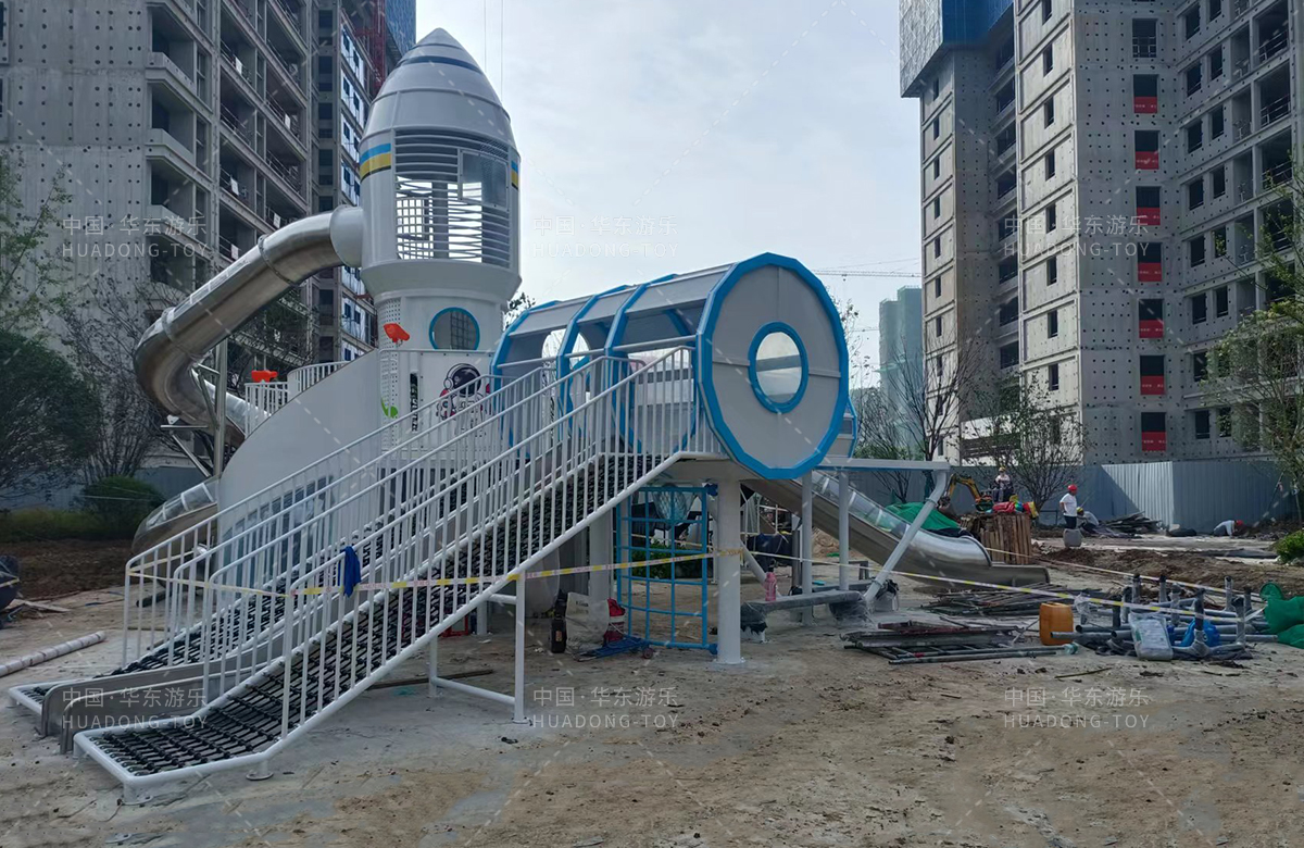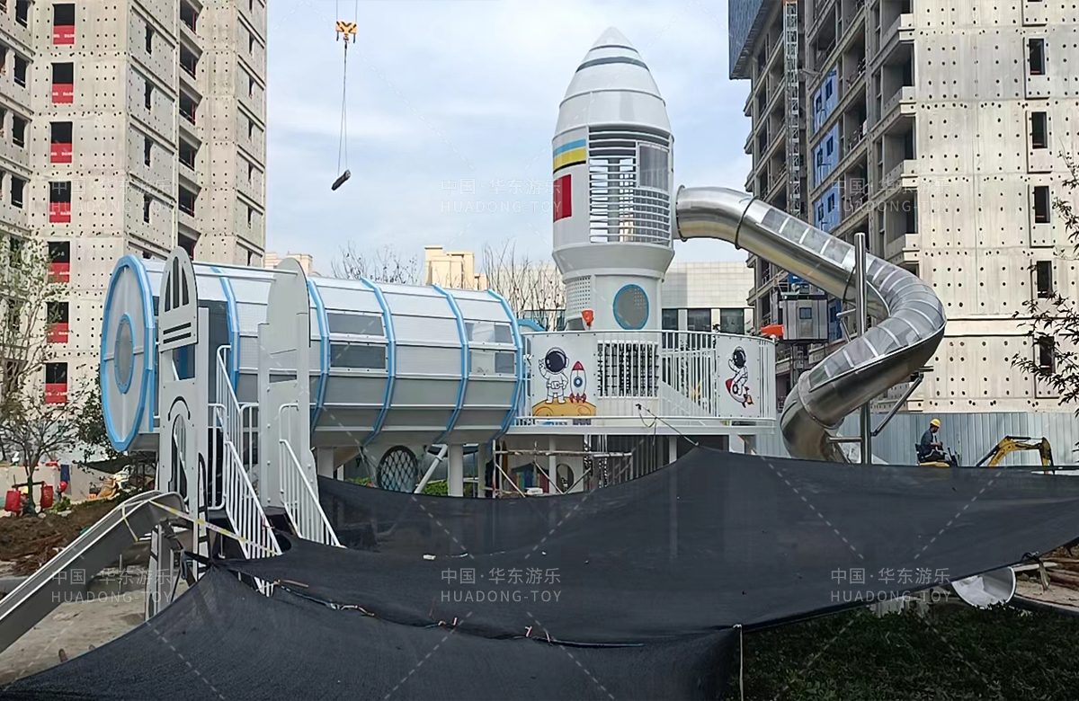 安徽省亳州市涡阳县荣徽上河郡选用的是ky开元游乐自主研发和生产的以航天飞机为主题的大型非标定制的游乐设备,是一款具备了攀爬网、攀爬梯、旋转滑筒、儿童摇摇乐为一体的综合性儿童游乐场。