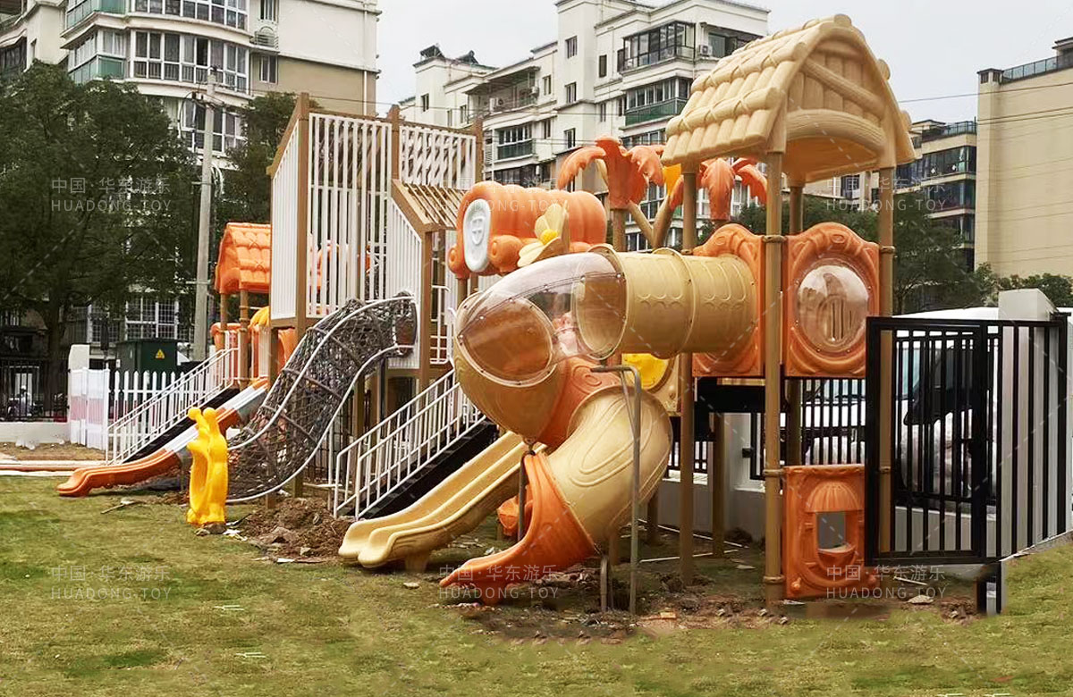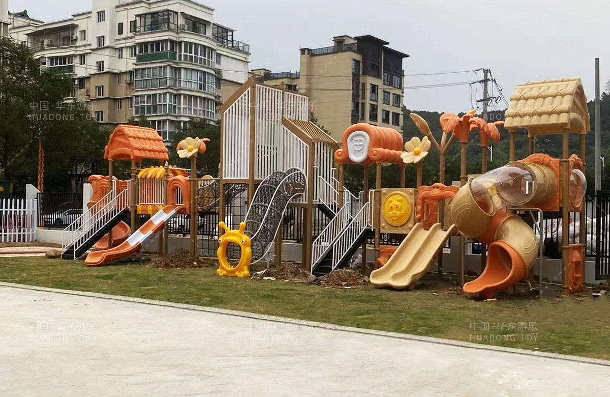 永嘉县童真幼儿园是一家专业的学前培训学校,此次选用的儿童游乐设备是ky开元游乐自主研发和设计的大型户外组合滑梯,该滑梯是一款具备了攀爬网、大型滑筒、旋转滑梯、直行走梯、双人滑梯等功能为一体的综合性游乐设备。