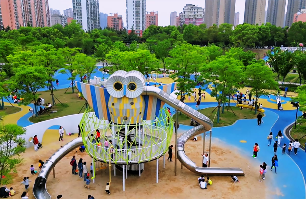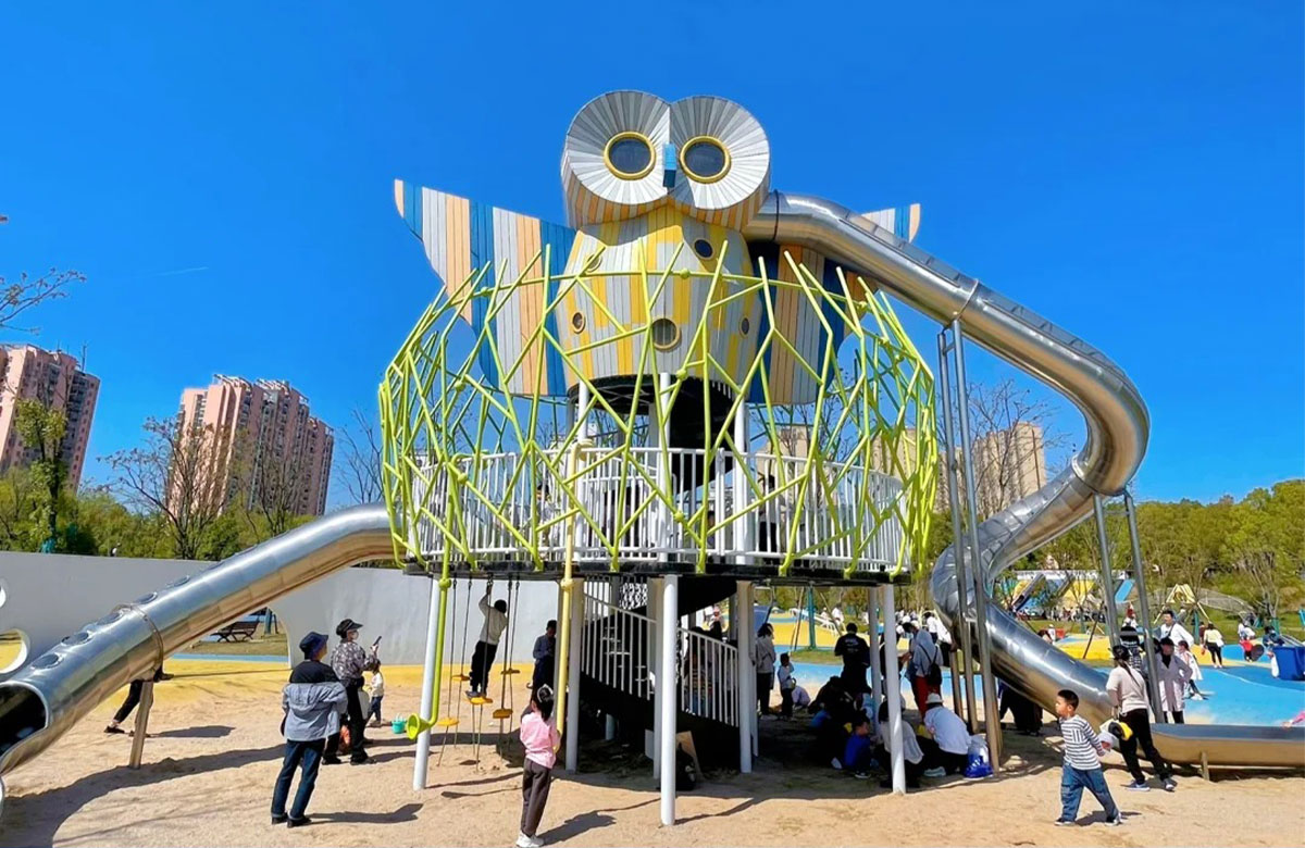 张毕湖公园定位为生态水体公园,是一个兼具湿地科普和放松休闲功能的城市综合公园。 该项目选用的是ky开元游乐自主研发和设计的综合性游乐设备,分别设置了猫头鹰主题的组合滑梯,各种类型的组合秋千、不锈钢滑梯、攀爬绳等游乐设备。 公园内设有服务设施丰富的滨水活力区、景色优美、植被茂盛的林下休憩区和供人们休闲嬉戏的水岸游憩区。