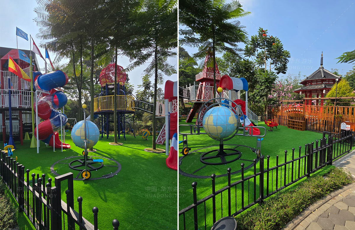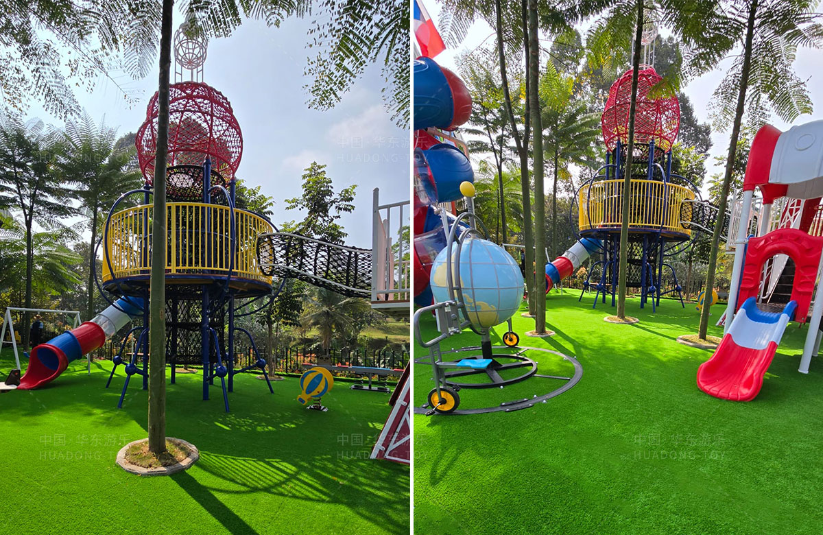 该项目选用的是ky开元游乐自主研发和设计的跨国系列组合滑梯,该滑梯具备了攀爬网、钻洞、滑梯等功能,同时为了让整个游乐场变得更加具有生机与活力,整个项目还设置了小朋友喜欢的儿童摇摇乐、儿童跷跷板、以及地球旋转自行车等游乐设备,为当地的人群体提供了一个休闲娱乐的场所。