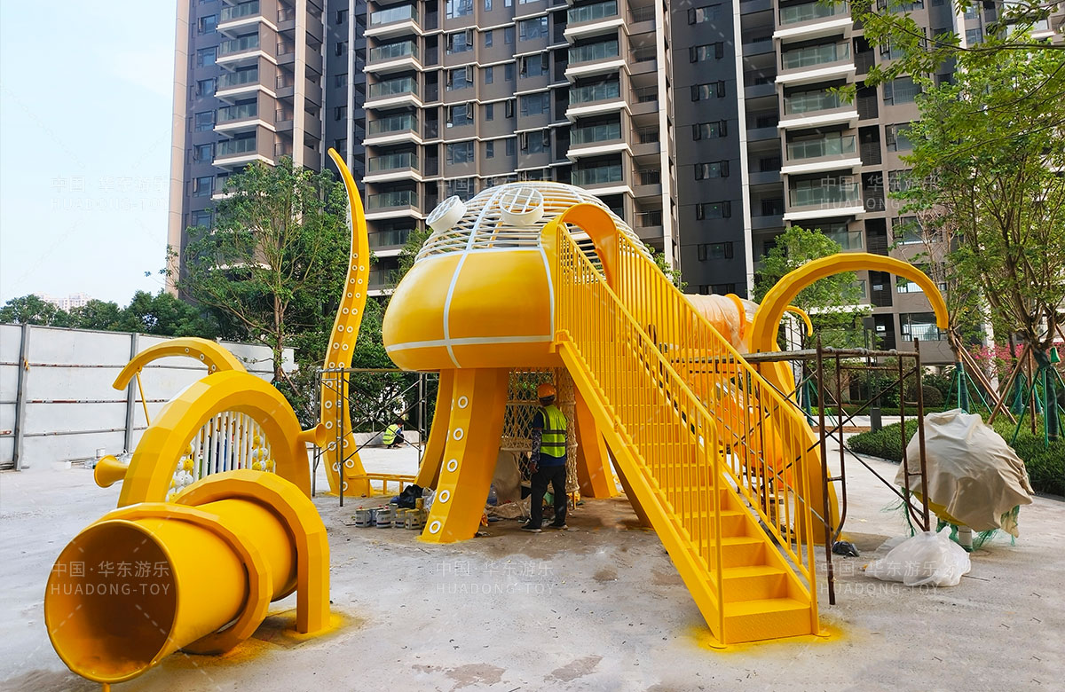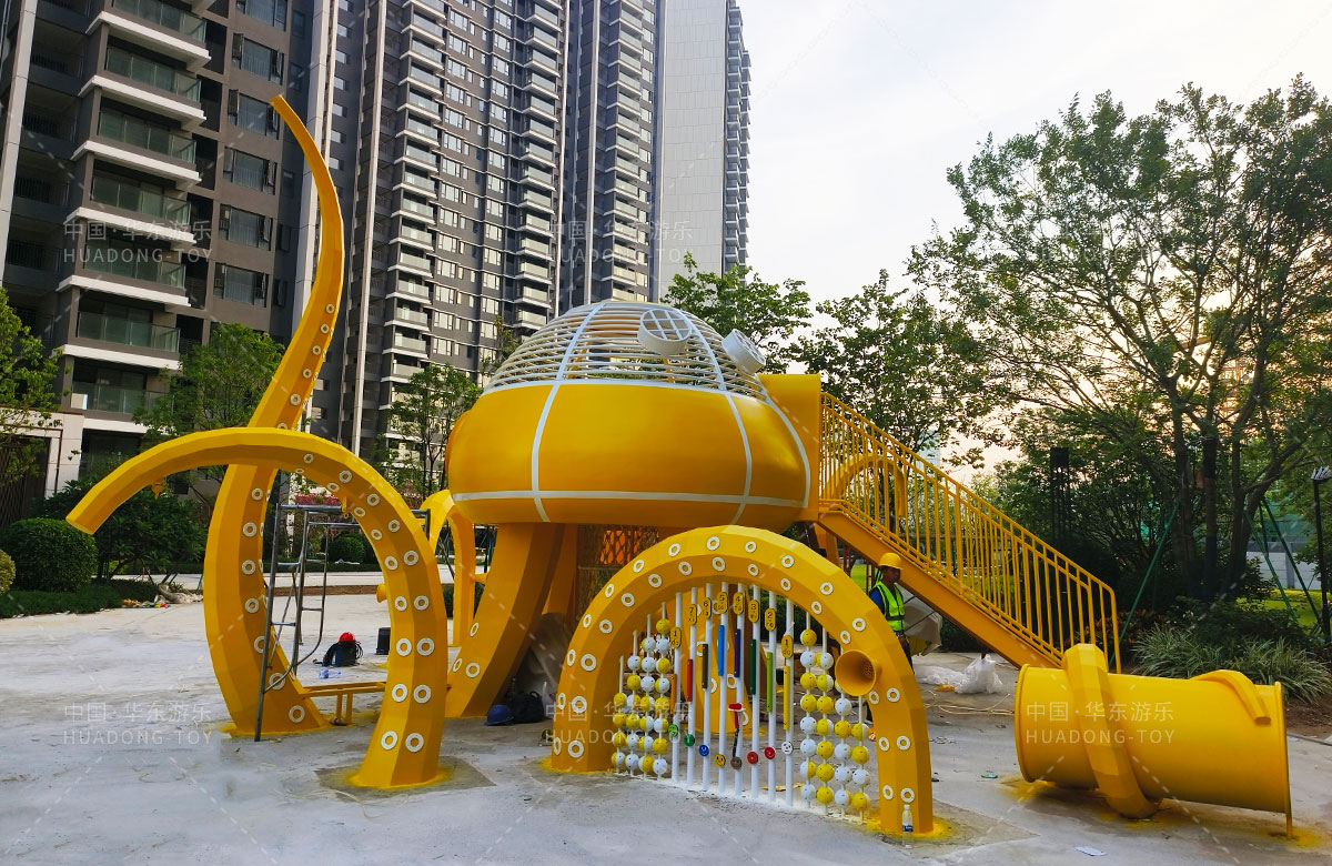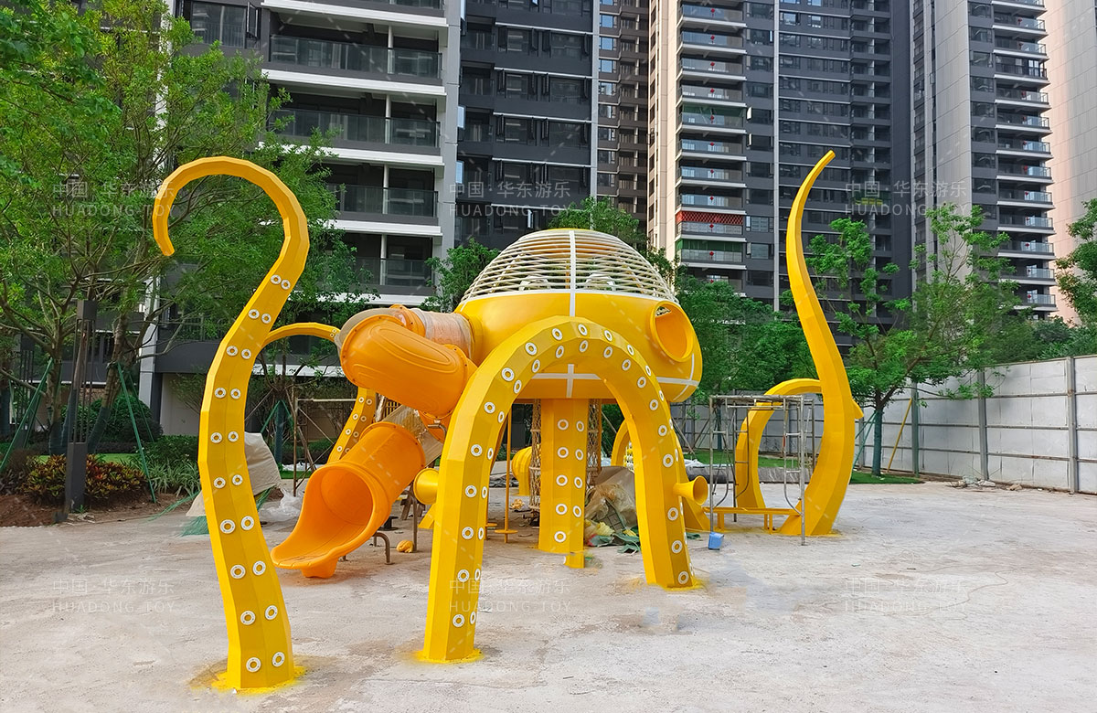 中海地产汕头阅江府选用的是ky开元游乐自主研发和设计的以章鱼为主题而设计的非标定制的章鱼主题综合游乐园,整个游乐园用一个大型的章鱼设备为主题,设计了集钻洞、攀爬网、滑梯、打击乐器等功能为一体的综合性游乐设备,为生活在当地的人群提供了一个休息娱乐的场所,也为小朋友们的健康成长提供了保障。