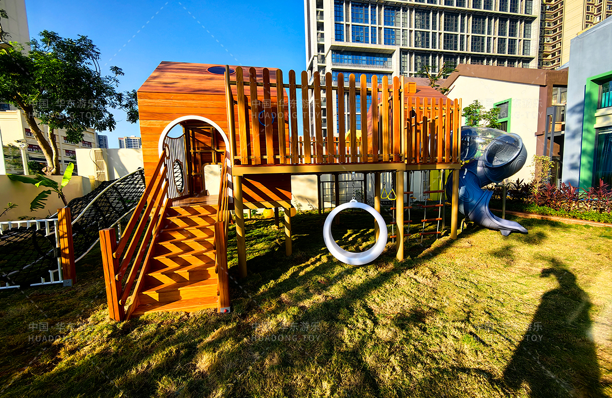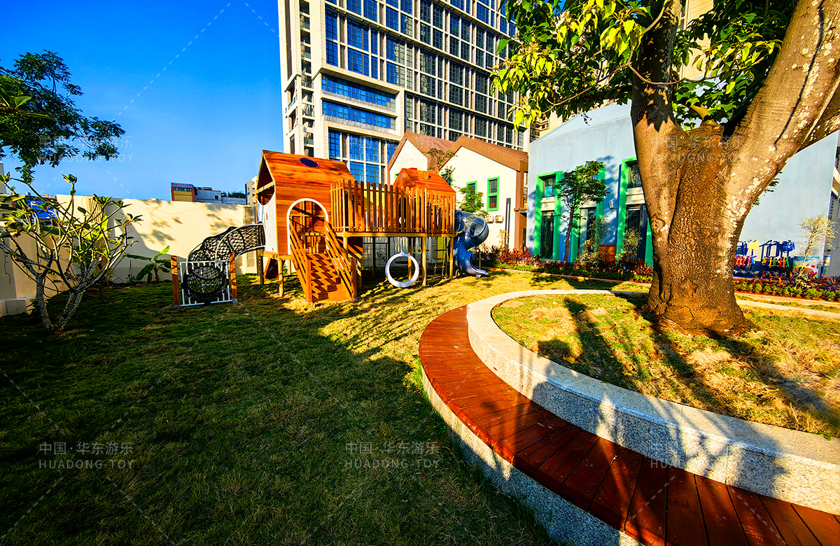 海南省农垦总局机关幼儿园选用的是ky开元游乐自主研发和设计的木质系列非标定制的游乐设备,该游乐设备具备了攀爬网、攀爬梯、月亮秋千、旋转滑梯、儿童秋千、平衡绳等功能为一体,该游乐设备的设置不仅仅为孩子们的玩耍提供看保障,更是为老师的教学提供了帮助。